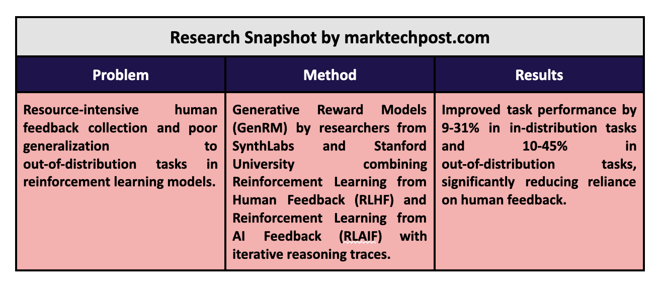 The post Generative Reward Models (GenRM): A Hybrid Approach to Reinforcement Learning from Human and AI Feedback, Solving Task Generalization and Feedback Collection Challenges appeared first on MarkTechPost.