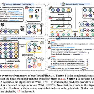 In conclusion, researchers introduced WORFBENCH, a method to evaluate workflow generation capabilities in LLM agents. Through the WORFEVAL system’s quantitative algorithms, the researchers revealed substantial performance gaps between linear and graph-structured workflow generation across various LLM architectures. The paper highlights the current limitations of LLM agents in complex workflow planning and provides a foundation for future improvements in agent architecture development. However, the proposed method has some limitations. While enforcing strict quality control on the node chain and workflow graph, some queries might have quality issues. Also, the workflow currently follows a one-pass generation paradigm and assumes all nodes require traversal to complete the task.