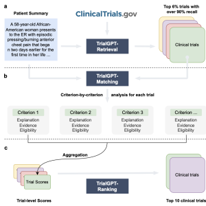 To address these challenges, the researchers developed TrialGPT, a groundbreaking framework that leverages large language models (LLMs) to streamline patient-to-trial matching. These three major parts constitute the composition of TrialGPT: TrialGPT-Retrieval, which filters out most irrelevant trials with the help of hybrid fusion retrieval and keywords generated from patient summaries; TrialGPT-Matching, which performs detailed evaluation of the eligibility of patients at criterion level, hence providing natural language explanations and evidence localization; and TrialGPT-Ranking, which aggregates criterion-level results into trial-level scores to prioritize and rule out. This framework integrates deep natural language understanding and generation capabilities, guaranteeing accuracy, explainability, and flexibility for analyzing unstructured medical data.