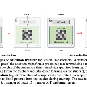 Attention Copy transfers pre-trained attention maps to a student model, effectively guiding how tokens interact without retaining learned features. This setup requires both the teacher and student models during inference, which may add computational complexity. Attention Distillation, on the other hand, refines the student model’s attention maps through a loss function that compares them to the teacher’s patterns. After training, the teacher is no longer needed, making this approach more practical. Both methods leverage the unique architecture of ViTs, where self-attention maps dictate inter-token relationships, allowing the student to focus on learning its features from scratch.