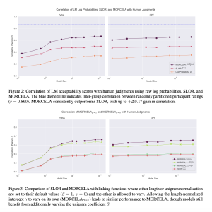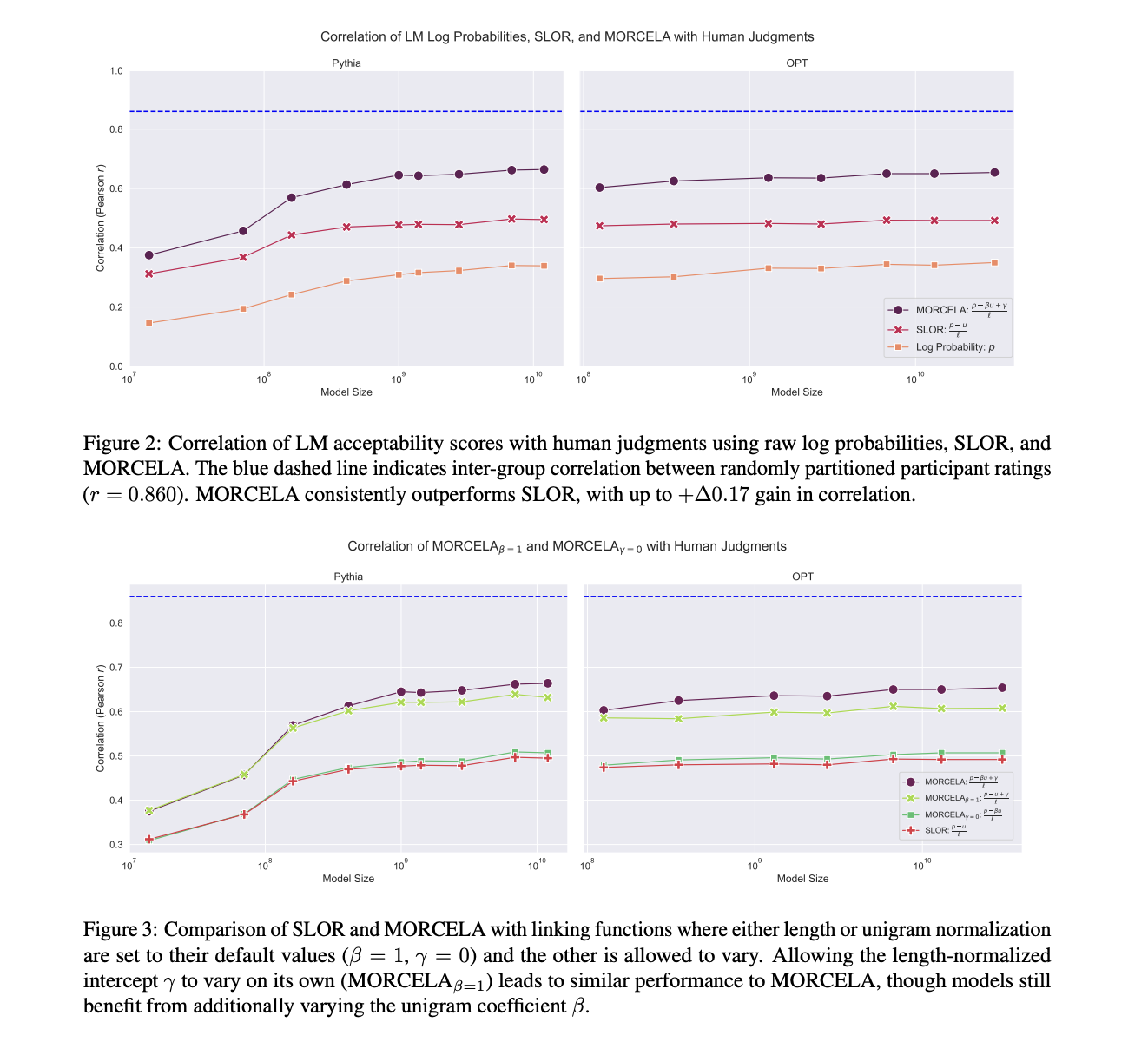 A team of researchers from NYU and CMU propose MORCELA (Magnitude-Optimized Regression for Controlling Effects on Linguistic Acceptability), which introduces a new linking theory that addresses these challenges. Unlike SLOR, which applies static adjustments for length and unigram frequency, MORCELA estimates the optimal level of adjustment from data, using learned parameters specific to these effects. By incorporating parameters—β for unigram frequency and γ for sentence length—MORCELA adjusts the LM scores, resulting in improved correlation with human judgments. This approach better accounts for how LMs perceive the rarity of words and the length of sentences compared to human expectations. The core idea behind MORCELA is that not all language models should receive the same correction, as models differ in how well they predict linguistic acceptability.