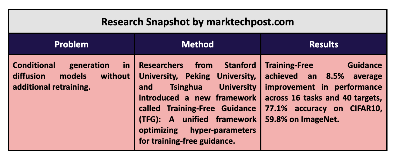 Researchers from Stanford University, Peking University, and Tsinghua University introduced a new framework called Training-Free Guidance (TFG). This algorithmic innovation unifies existing conditional generation methods into a single design space, eliminating the need for retraining while enhancing flexibility and performance. TFG reframes conditional generation as a problem of optimizing hyper-parameters within a unified framework, which can be applied seamlessly to various tasks. By integrating tools like mean guidance, variance guidance, and implicit dynamic modeling, TFG expands the design space available for training-free conditional generation, offering a robust alternative to traditional approaches.