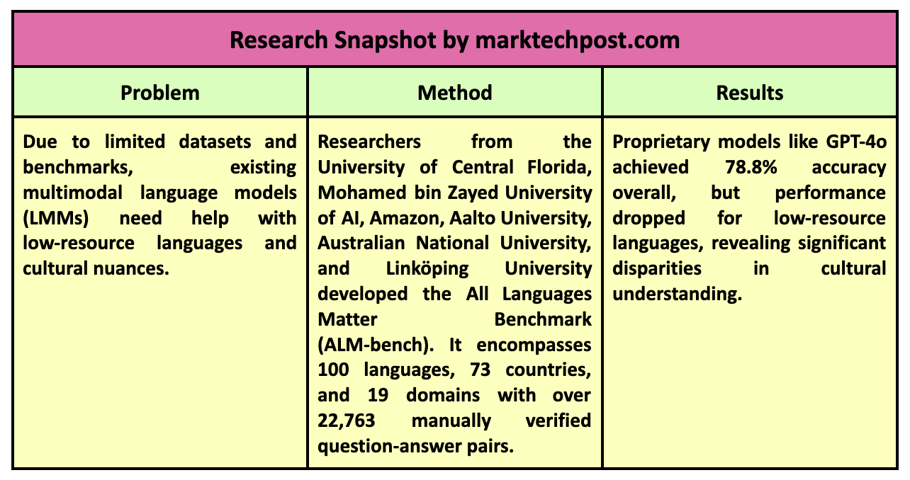 The post All Languages Matter Benchmark (ALM-bench): A Comprehensive Evaluation Framework to Enhance Multimodal Language Models for Cultural Inclusivity and Linguistic Diversity Across 100 Global Languages appeared first on MarkTechPost.