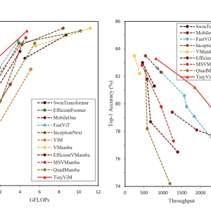 TinyViM’s performance advantages are underscored by its lightweight design, which achieves remarkable throughput without compromising accuracy. For instance, TinyViM-B attained an accuracy of 81.2% on ImageNet-1K, outperforming MobileOne-S4 by 1.8%, Agent-PVT-T by 2.8%, and MSVMamba-M by 1.4%. In detection tasks, TinyViM-B demonstrated 46.3 APbox and 41.3 APmask, while TinyViM-L extended these improvements to 48.6 APbox and 43.8 APmask, affirming its scalability and versatility across task sizes.