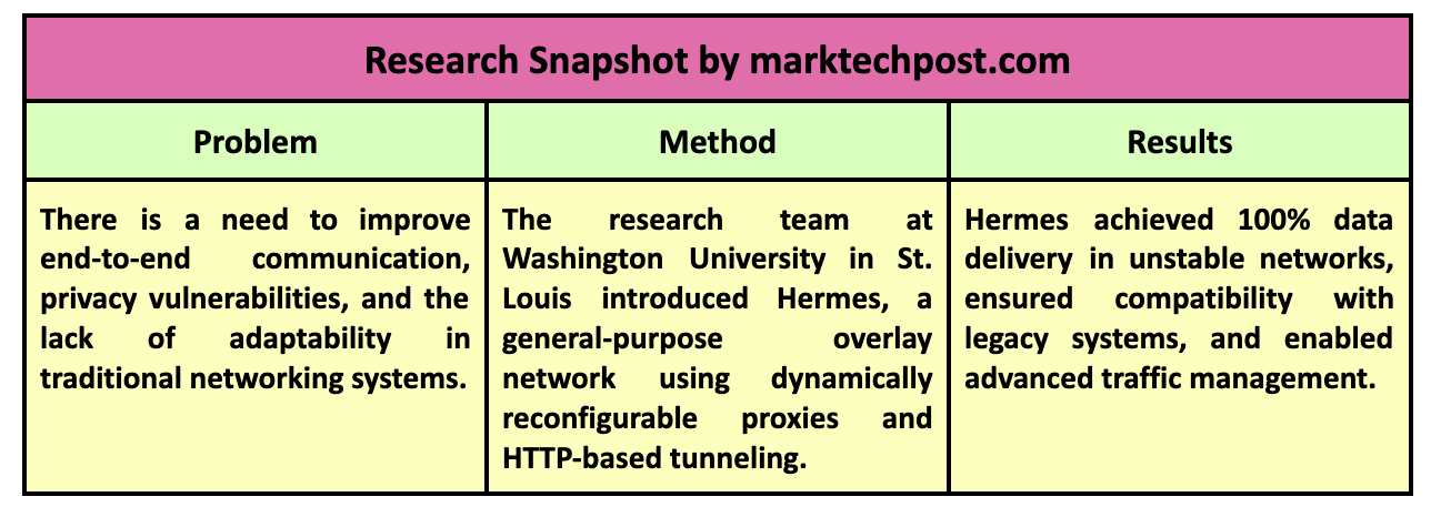 The research team at Washington University in St. Louis introduced Hermes, a novel networking architecture designed to address these persistent challenges. Hermes constructs a general-purpose overlay network using dynamically reconfigurable proxies. This architecture shifts the responsibility of networking from applications to the overlay, ensuring seamless integration and efficient communication across diverse environments. By employing HTTP as a unifying protocol, Hermes fills the gap between legacy systems and modern demands, offering robust solutions for end-to-end communication.