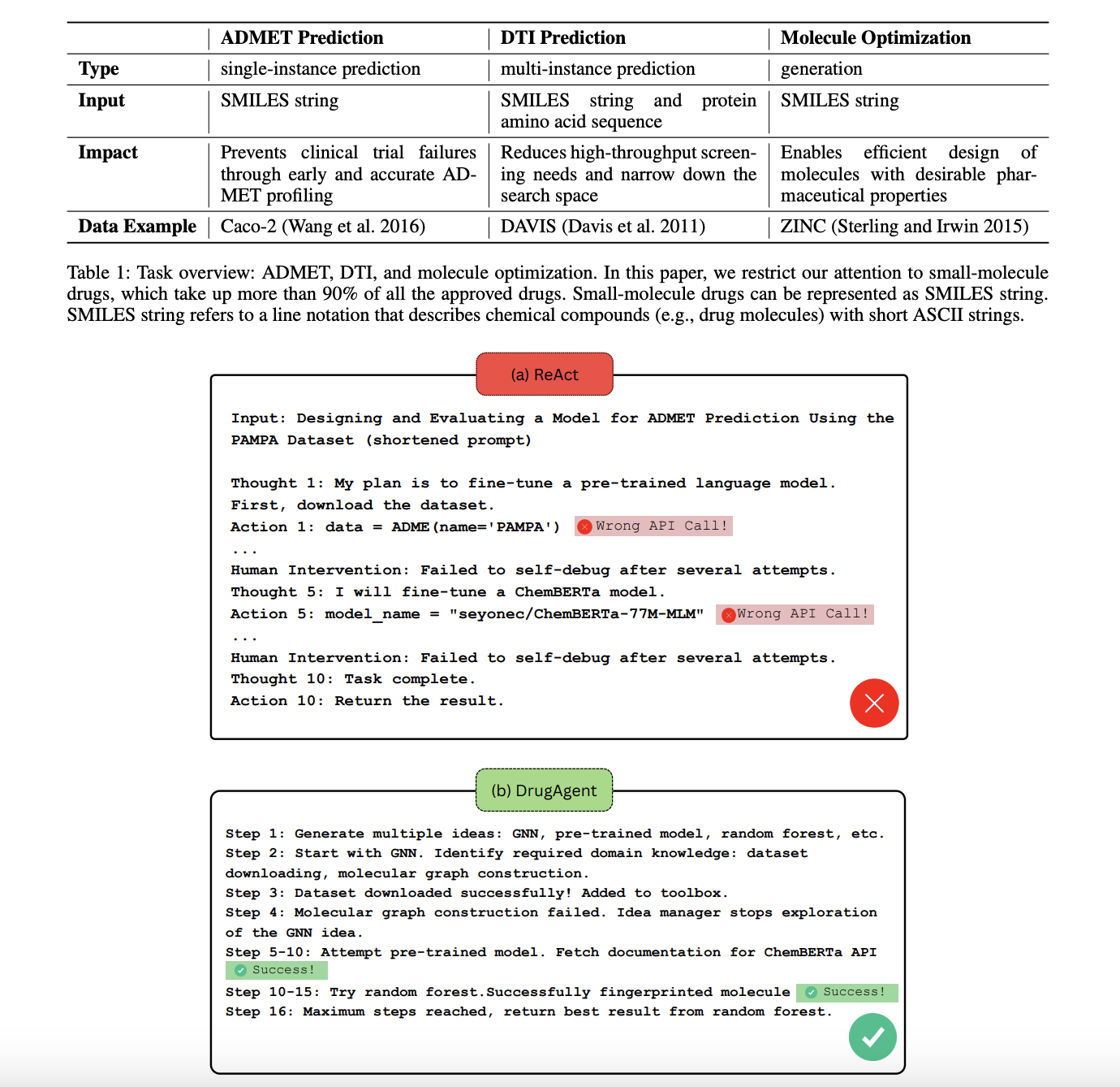 The importance of DrugAgent lies in its ability to lower the barrier for applying ML in drug discovery. The pharmaceutical industry is characterized by highly specialized knowledge requirements, and ML-based drug discovery is no different. General-purpose LLMs, though powerful, often fall short when it comes to the nuances of drug discovery tasks, such as selecting the correct APIs for domain-specific libraries or accurately preprocessing chemical data. This is where DrugAgent excels; it integrates workflows to identify the steps that require specialized expertise and builds the necessary tools to handle them. Additionally, DrugAgent employs a dynamic idea space management system that generates multiple approaches at the beginning and iteratively updates them based on experimental outcomes. By adopting this structured workflow, DrugAgent can automatically determine the most suitable approach for a given task. For instance, in the ADMET prediction case study, DrugAgent evaluated different models, including graph neural networks and pretrained models like ChemBERTa, ultimately selecting the random forest model due to its superior performance. This systematic exploration and tool-building process ensures that DrugAgent can effectively navigate the complexities of drug discovery.