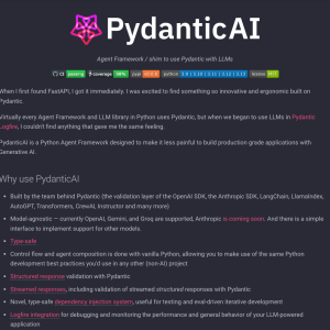 PydanticAI is a new Python-based agent framework designed to build production-grade LLM-powered applications. Developed by the team behind Pydantic, PydanticAI addresses common challenges faced by developers working with LLMs while incorporating the proven strengths of Pydantic. It is model-agnostic, allowing developers to use various LLMs while benefiting from Pydantic’s robust type-safe response validation. The framework aims to help developers create reliable and scalable LLM-based applications by offering features that support the entire application development lifecycle, particularly in production settings.