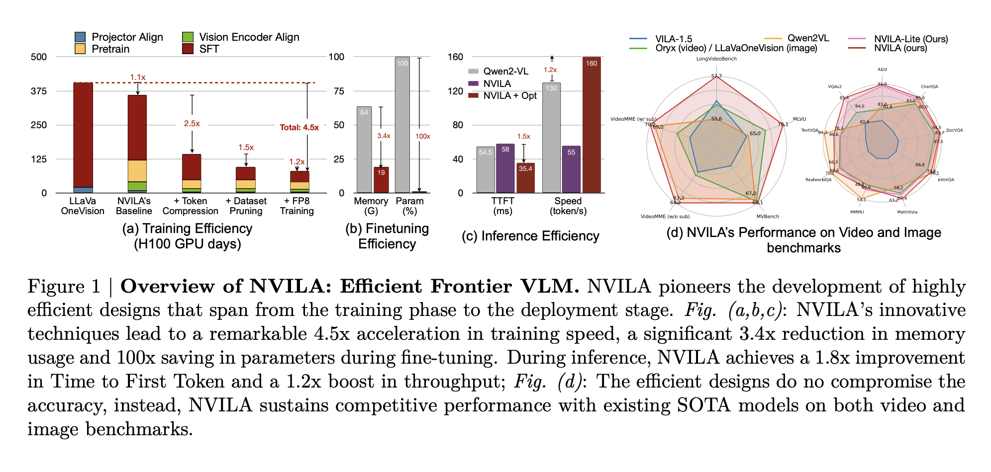 NVILA incorporates further innovations to streamline training and fine-tuning. Techniques like FP8 mixed precision and dataset pruning accelerate training and lower memory usage. Adaptive learning rates and parameter-efficient fine-tuning ensure the model can handle domain-specific tasks without excessive resource demands. During deployment, NVILA uses advanced quantization—W8A8 for the vision tower and W4A16 for language components—to speed up inference while maintaining performance.