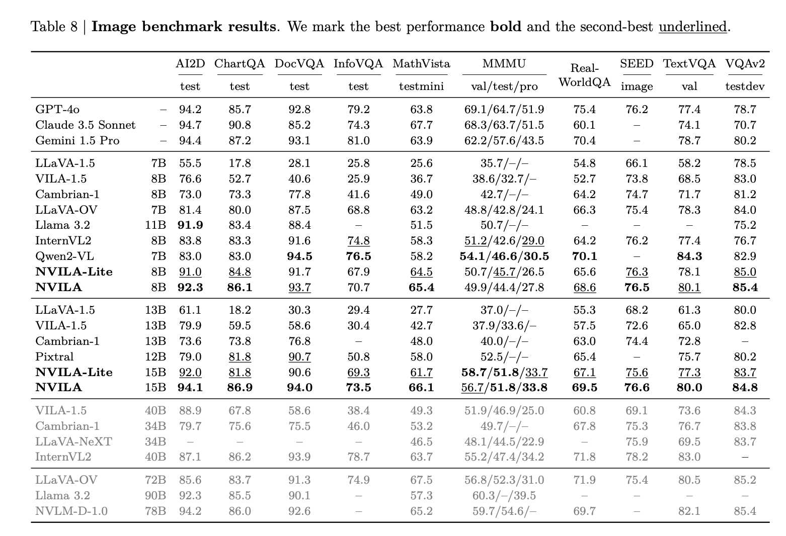 NVILA’s design optimizes every stage of the model lifecycle. It reduces training costs by 4.5×, cuts fine-tuning memory requirements by 3.4×, and improves inference speeds by 1.6 to 2.8× compared to other VLMs. Importantly, these gains do not come at the expense of accuracy. NVILA performs on par with or better than many benchmarks, excelling in visual question answering, video understanding, and document processing tasks. NVIDIA also plans to release NVILA’s code and models, fostering greater accessibility and reproducibility.