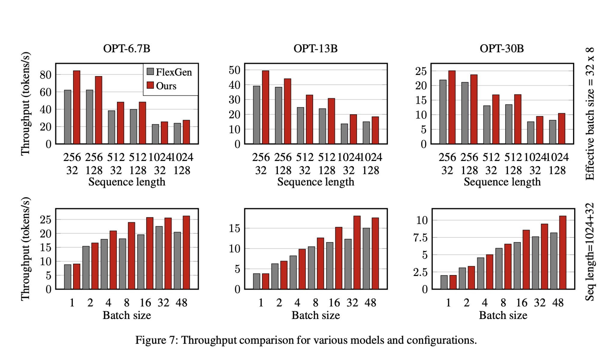 Row-by-Row Schedule: Reduces latency with a row-by-row execution plan. Here, the GPU begins reconstructing the KV cache while the remaining activations are asynchronously loading. Column-by-Column Schedule: Maximizes throughput and accommodates significant batch size inference by reusing model weights across batches. It overlaps the transmission of KV cache and activations with the computation of MHA (multi-headed attention) across multiple batches instead of processing each layer sequentially in a batch.Further using a six-process communication parallelism strategy, the Runtime Module enables concurrent GPU computation and CPU-GPU communication.