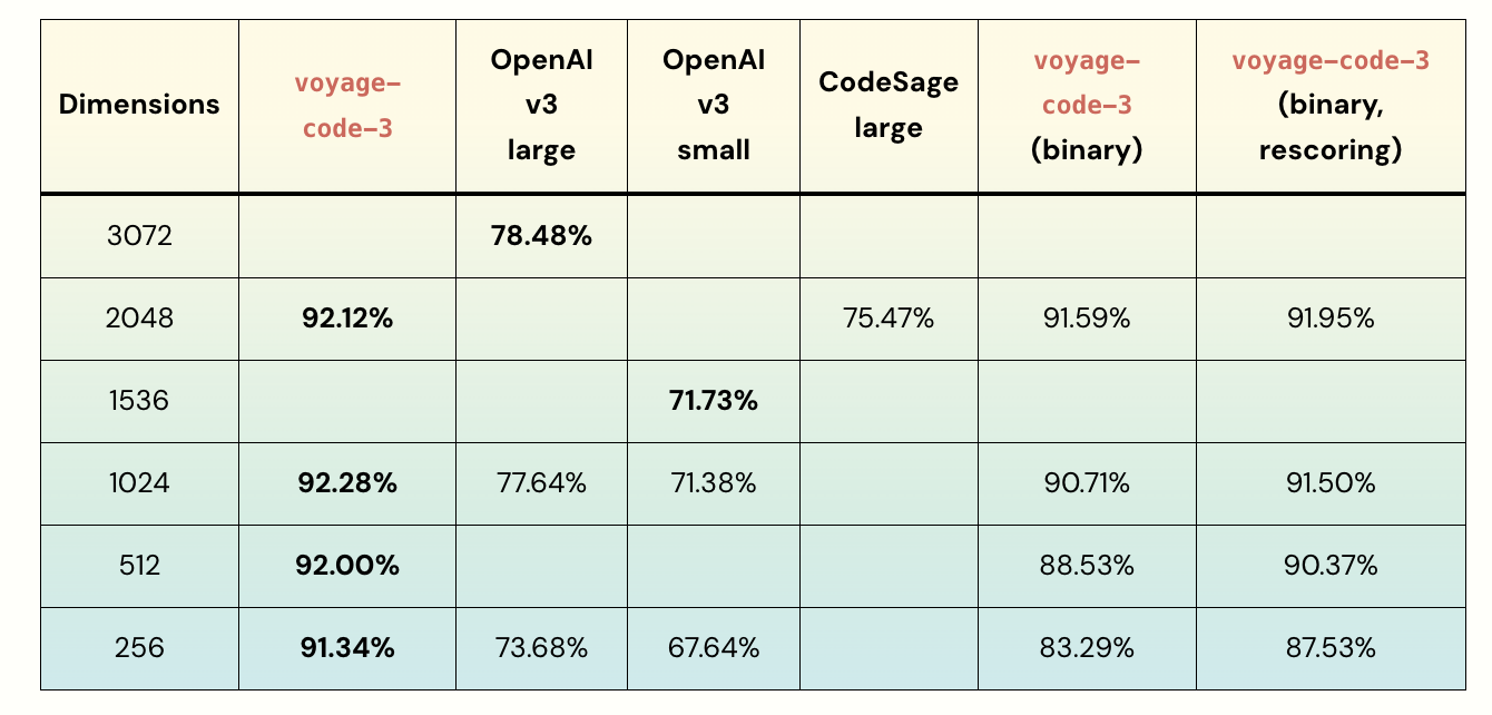 Voyage-code-3 emerges as an innovative embedding model that sets new benchmarks in code retrieval technology. The model demonstrates exceptional performance, significantly surpassing existing solutions like OpenAI-v3-large and CodeSage-large across a comprehensive suite of 238 code retrieval datasets. With impressive average performance improvements of 13.80% and 16.81%, respectively, voyage-code-3 represents a significant leap forward in embedding model capabilities. Its versatile design supports multiple embedding dimensions ranging from 256 to 2048, providing users with unprecedented flexibility in balancing retrieval quality and computational efficiency.