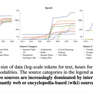 - Over 70% of speech and video datasets are derived from web platforms like YouTube, while synthetic sources are becoming increasingly popular, accounting for nearly 10% of all text data tokens.