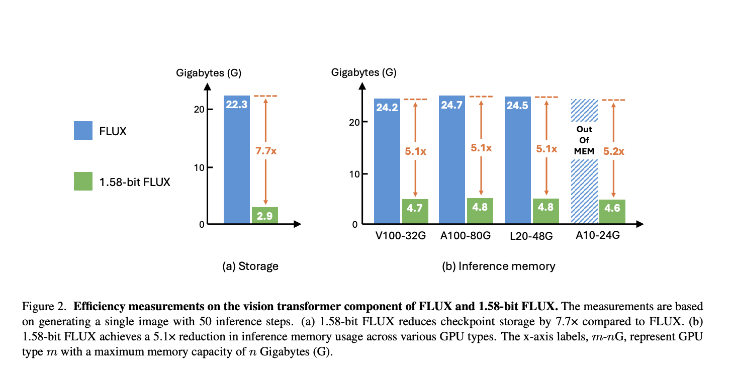 Researchers from ByteDance have introduced the 1.58-bit FLUX model, a quantized version of the FLUX Vision Transformer. This model reduces 99.5% of its parameters (11.9 billion in total) to 1.58 bits, significantly lowering computational and storage requirements. The process is unique in that it does not rely on image data, instead using a self-supervised approach based on the FLUX.1-dev model. By incorporating a custom kernel optimized for 1.58-bit operations, the researchers achieved a 7.7× reduction in storage and a 5.1× reduction in inference memory usage, making deployment in resource-constrained environments more feasible.