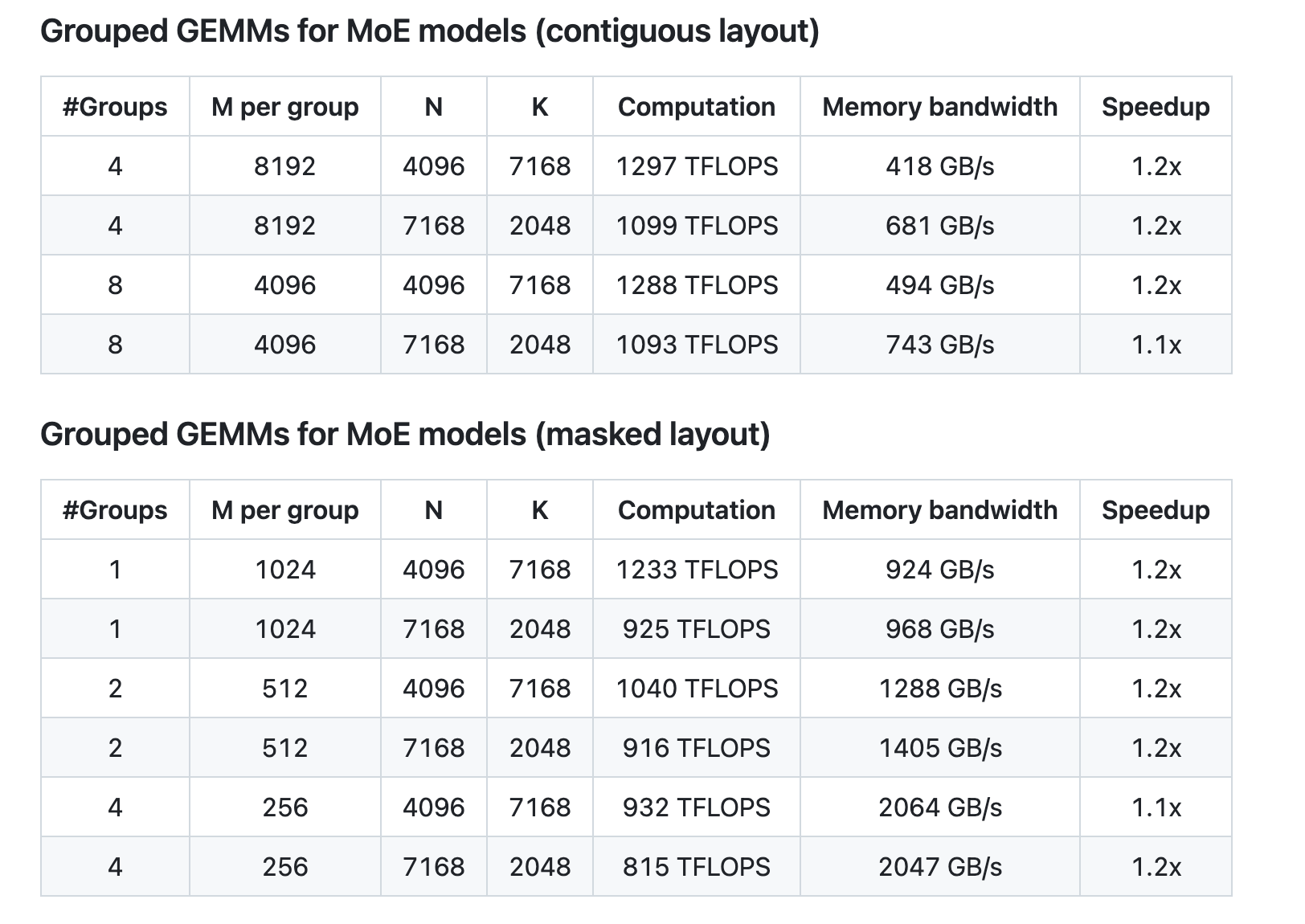 The performance data provided in the DeepGEMM repository offers clear picture of its efficiency improvements. Testing on NVIDIA H800 GPUs with NVCC 12.8 indicates that, across a range of matrix dimensions, DeepGEMM achieves speedups that compare favorably with a carefully optimized CUTLASS-based implementation. For instance, normal GEMM operations demonstrate speedup factors ranging from approximately 1.4x to 2.7x, depending on the specific matrix shape. In the context of grouped GEMMs for MoE models, both contiguous and masked layouts show consistent improvements, albeit more modest, with speedups around 1.1x to 1.2x.