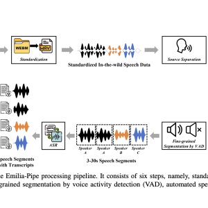 - Speaker Diarization: Natural speech recordings frequently contain multiple speakers. Emilia-Pipe uses advanced diarization tools to segment long audio streams into individual speaker segments. This step is crucial for ensuring that each segment contains speech from a single speaker, which in turn helps models capture unique speaker characteristics.