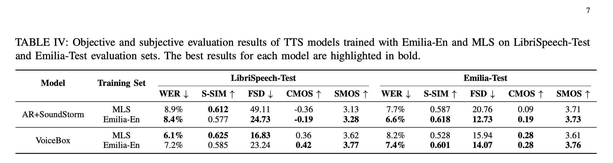The effectiveness of the Emilia dataset is evident through a series of comparative studies with traditional audiobook-based datasets. Models trained on Emilia have been evaluated on several objective metrics—such as word error rate (WER), speaker similarity (S-SIM), and Fréchet Speech Distance (FSD)—as well as through subjective listening tests.