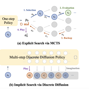 To mitigate these issues, researchers from The University of Hong Kong, Shanghai Jiaotong University, Huawei Noah’s Ark Lab, and Shanghai AI Laboratory proposed DIFFUSEARCH. This discrete diffusion-based framework eliminates explicit search algorithms like MCTS. Instead of relying on costly search processes, DIFFUSEARCH trains the policy to directly predict and utilize future representations, refining predictions iteratively using diffusion models. Integrating the world model and policy into a single framework reduces computational overhead while improving efficiency and accuracy in long-term planning.
