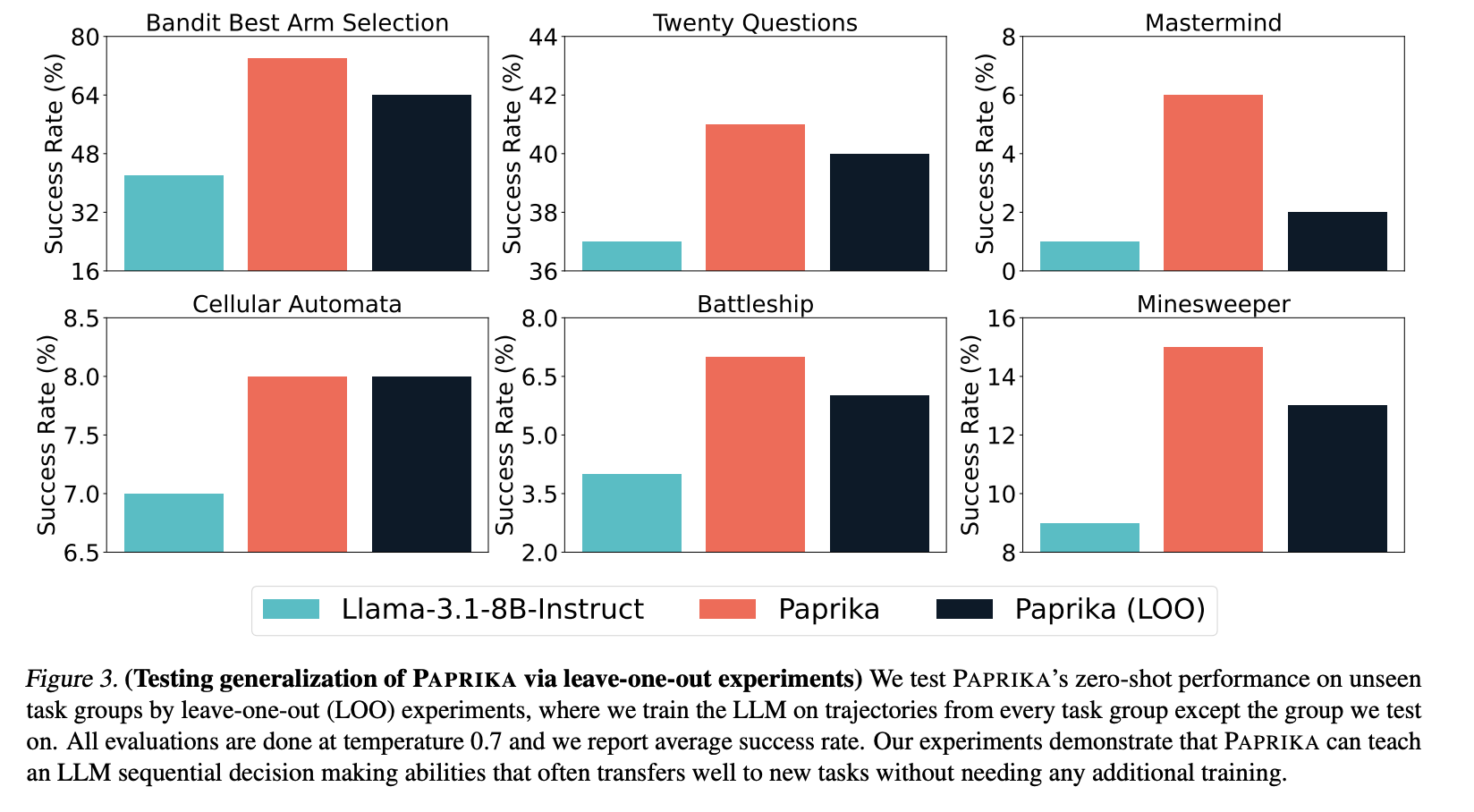 Further experiments using a leave-one-out evaluation demonstrated that the decision-making strategies learned through PAPRIKA could generalize to previously unseen tasks. For example, when the model was trained on all but one group of tasks, it still performed competitively on the omitted group. This finding suggests that the strategies developed through this fine-tuning method are not narrowly tailored to specific tasks but can be transferred across different decision-making scenarios. Moreover, a study involving curriculum learning showed that selectively sampling training tasks according to their difficulty could yield additional improvements, reinforcing the value of a tailored, data-driven approach to task selection.