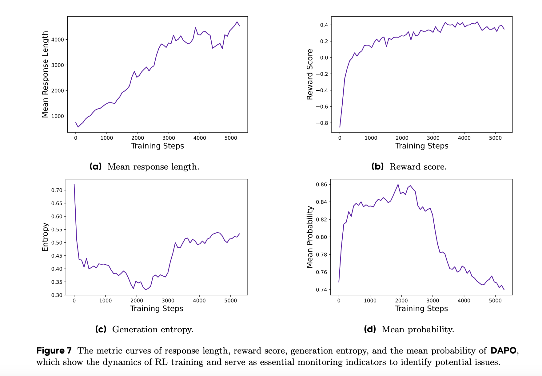 Beyond quantitative results, DAPO’s training dynamics provided insights into the model’s evolving reasoning patterns. Initially, the models showed little reflective behavior, often proceeding linearly through tasks without reconsideration of previous steps. However, with ongoing training, the models progressively exhibited more reflective behaviors, demonstrating a form of iterative self-review. This shift highlights the capability of reinforcement learning not only to enhance existing reasoning pathways but also to cultivate entirely new cognitive strategies over time.
