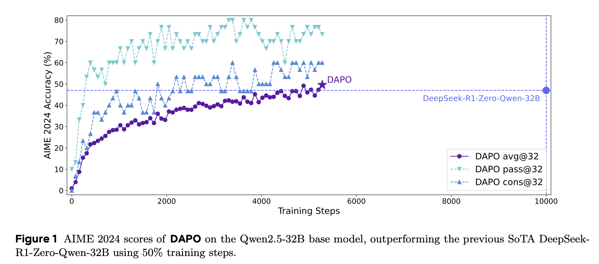 In practical experimentation, DAPO has demonstrated significant improvements. Evaluations on the American Invitational Mathematics Examination (AIME) 2024 benchmark show that DAPO-trained models achieved a score of 50 points using the Qwen2.5-32B base model, improving on previous methods such as DeepSeek-R1-Zero-Qwen-32B, which achieved 47 points. Notably, DAPO attained this improvement with approximately half the training steps, underscoring the efficiency of the proposed methods. A systematic analysis revealed incremental enhancements from each introduced technique, moving from a baseline of 30 points (using GRPO alone) up to 50 points with the full DAPO methodology.