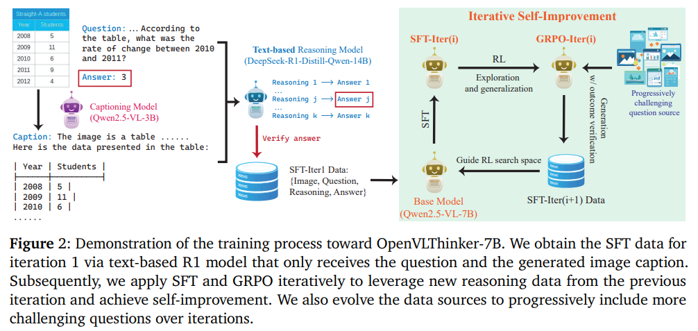 UCLA researchers developed OpenVLThinker-7B using a combined SFT and RL approach, starting from the Qwen2.5-VL-7B base model.