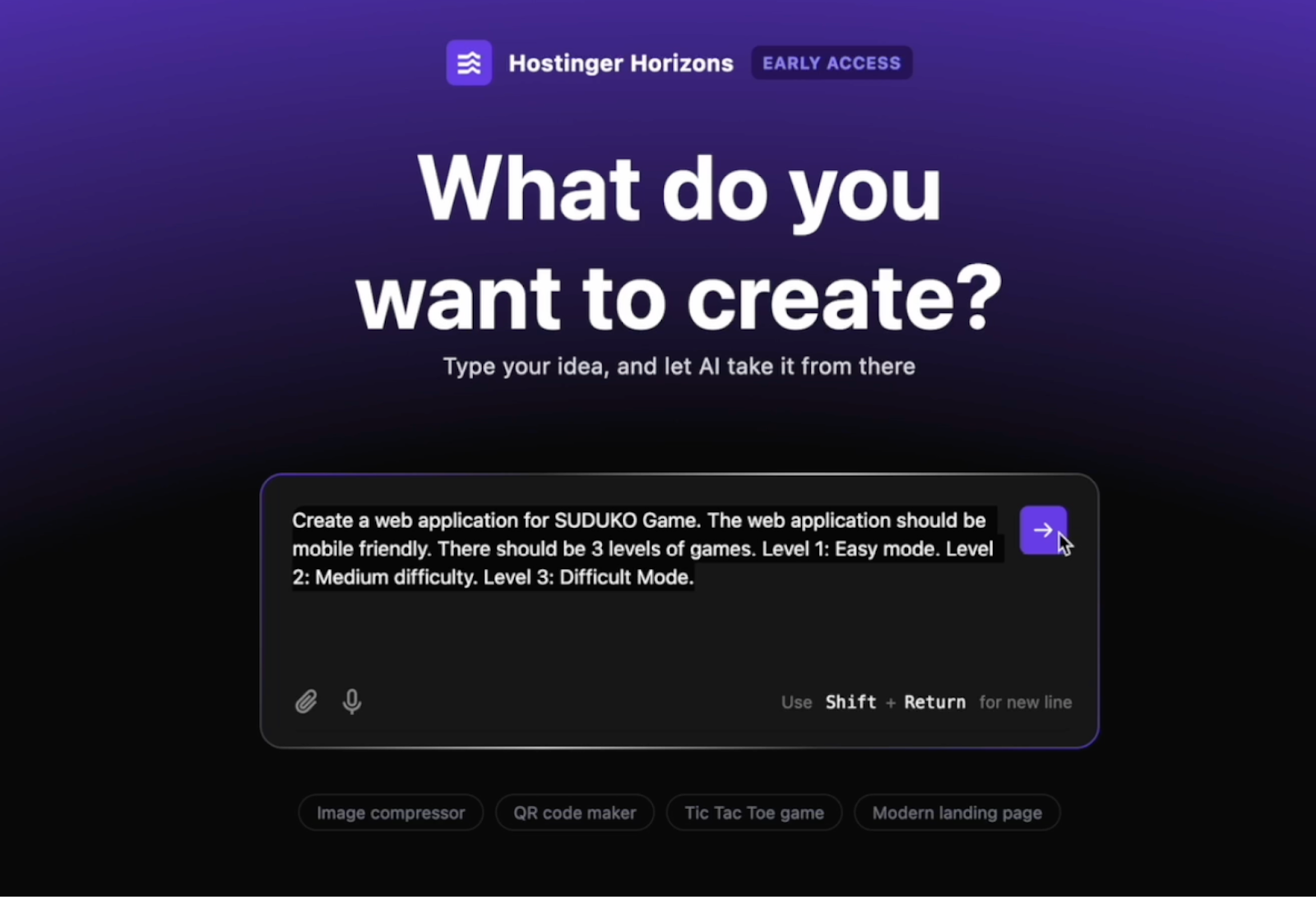 In the chat interface, describe the application you wish to create. For example: & a web application for SUDUKO Game. The web application should be mobile friendly. There should be 3 levels of games. Level 1: Easy mode. Level 2: Medium difficulty. Level 3: Difficult Mode.&