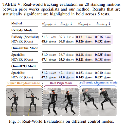outperforms specialized controllers across the board. The research team evaluated HOVER against specialist policies and alternative multi-mode training approaches through comprehensive tests in both IsaacGym simulation and real-world implementations using the Unitree H1 robot.