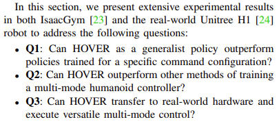 & prowess is not confined to the digital world. The experimental setup included motion tracking evaluations using the retargeted AMASS dataset in simulation and 20 standing motion sequences for the real-world tests on the 19-DOF Unitree H1 platform, weighing 51.5kg and standing 1.8m tall. The experiments were structured to answer three key questions about HOVER& generalizability, comparative performance, and real-world transferability.
