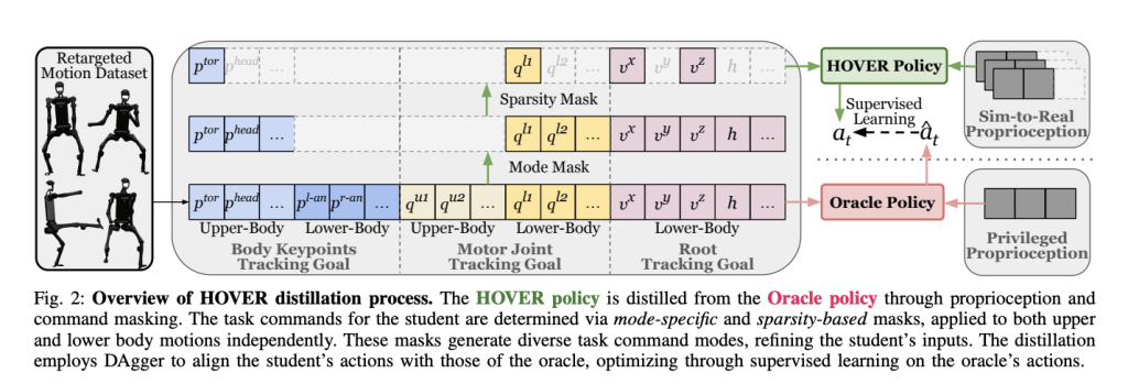 The magic truly happens through & distillation.&; The oracle policy, the master imitator, teaches a & policy&; (HOVER) its skills. Through a process involving command masking and a DAgger framework, learns to master diverse control modes, from kinematic position tracking to joint angle control and root tracking. This creates a &; capable of handling any control scenario.