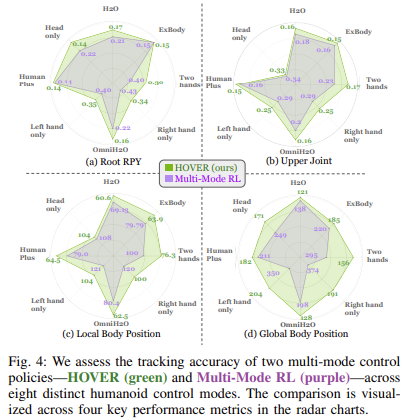 When compared to other multi-mode training methods, they implemented a baseline that used the same masking process but trained from scratch with reinforcement learning. Radar charts visualizing tracking errors across eight distinct control modes showed HOVER consistently achieving lower errors across all 32 metrics and modes. achieved consistently lower tracking errors across all 32 metrics and 8 distinct control modes. This decisive victory underscores the power of HOVER& distillation approach. This comprehensive performance advantage underscores the effectiveness of distilling knowledge from an oracle policy that tracks full-body kinematics rather than training with reinforcement learning from scratch.