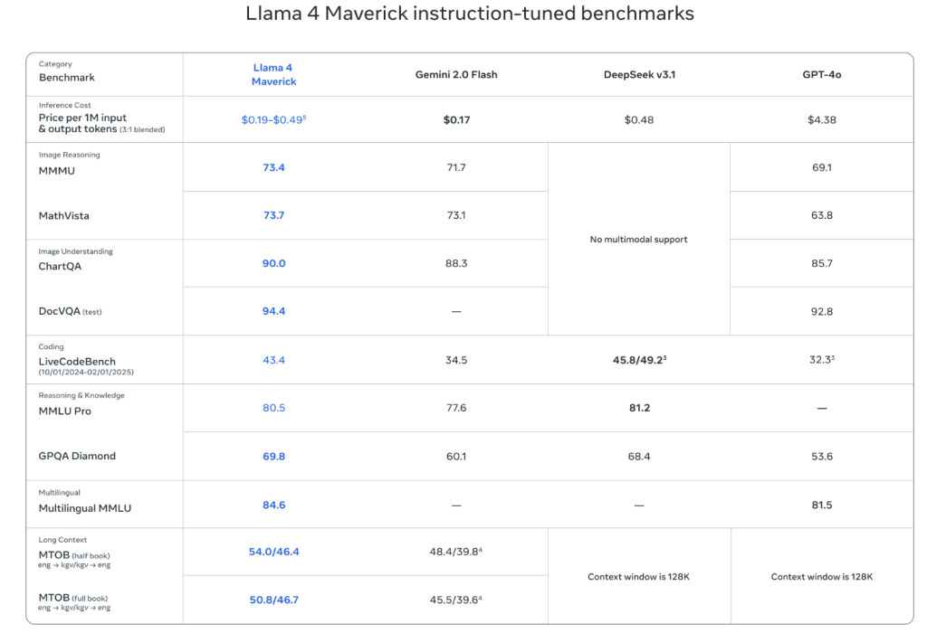 A key feature of Maverick is its noteworthy performance-to-cost efficiency. Benchmarking efforts, specifically on the LMArena platform, have recorded an Elo rating of 1417 for Maverick& chat-optimized version, indicating its computational efficiency and practical applicability in conversational and multimodal contexts.