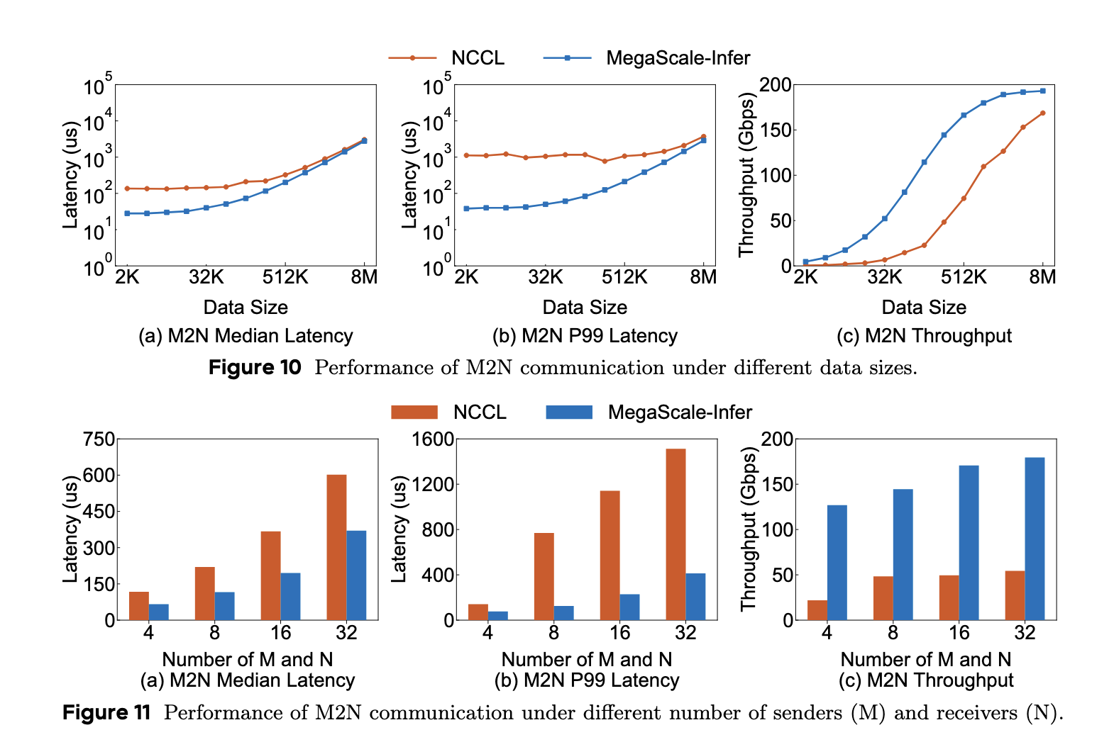To further optimize performance, MegaScale-Infer employs a ping-pong pipeline parallelism strategy. The idea is to break down batches of requests into smaller micro-batches that alternate between attention and FFN modules, ensuring that neither component sits idle. The system determines the optimal number of micro-batches required to maintain high utilization, considering compute time, communication latency, and hardware setup. For example, if the communication time is less than half the compute time, at least three micro-batches are used. Further, the system integrates a high-performance M2N communication library that avoids unnecessary GPU-to-CPU data copies, reducing latency and instability. This library replaces the traditional All-to-All routing with a more efficient sender-receiver model designed specifically for MoE& token dispatch pattern.