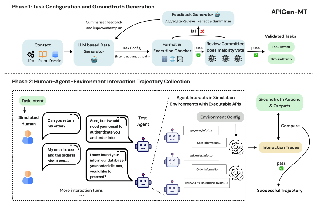 The architecture behind APIGen-MT is split into two main operational phases. In Phase 1, a task configuration is created using an LLM-driven generator that proposes user intent instructions, a sequence of groundtruth actions, and the expected outputs. These proposals are then validated for format correctness, executability, and semantic coherence using a combination of rule-based checkers and a multi-agent LLM review committee. If a proposal fails at any stage, a feedback mechanism will reflect on the errors and propose improvements. Successful tasks move to Phase 2, where a simulation engine generates realistic dialogues between a simulated human user and a test agent. The agent responds to user inputs by calling APIs, interpreting outputs, and evolving the conversation across turns. Only those dialogue trajectories that match the expected groundtruth are included in the final training dataset, ensuring functional accuracy and natural dialogue flow.