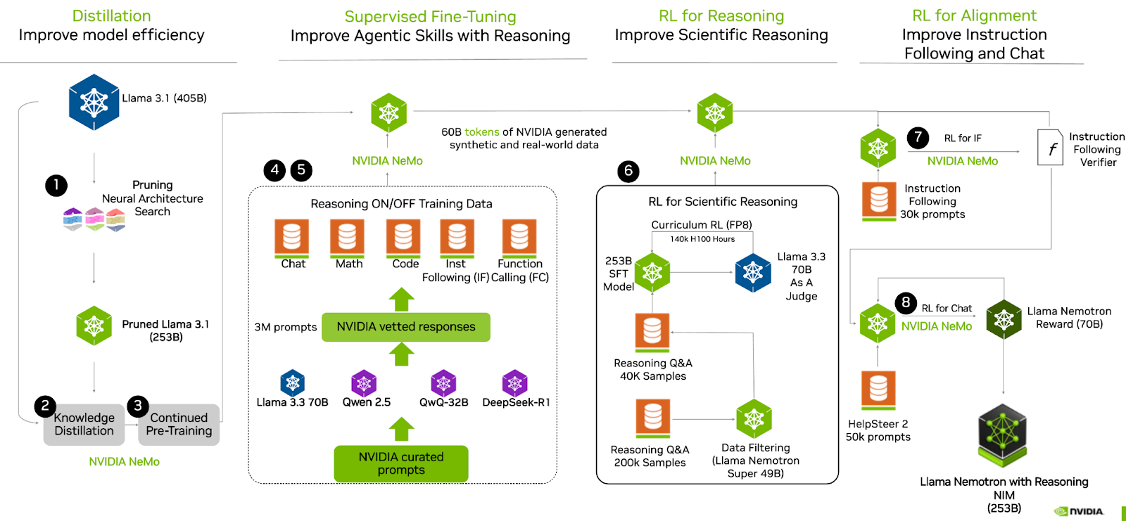 NVIDIA released the , a 253-billion parameter language model representing a significant leap in reasoning capabilities, architecture efficiency, and production readiness. This model is part of the broader Llama Nemotron Collection and is directly derived from Meta’s Llama-3.1-405B-Instruct architecture. The two other small models, a part of this series, are and . Designed for commercial and enterprise use, Nemotron Ultra is engineered to support tasks ranging from tool use and retrieval-augmented generation () to multi-turn dialogue and complex instruction-following.
