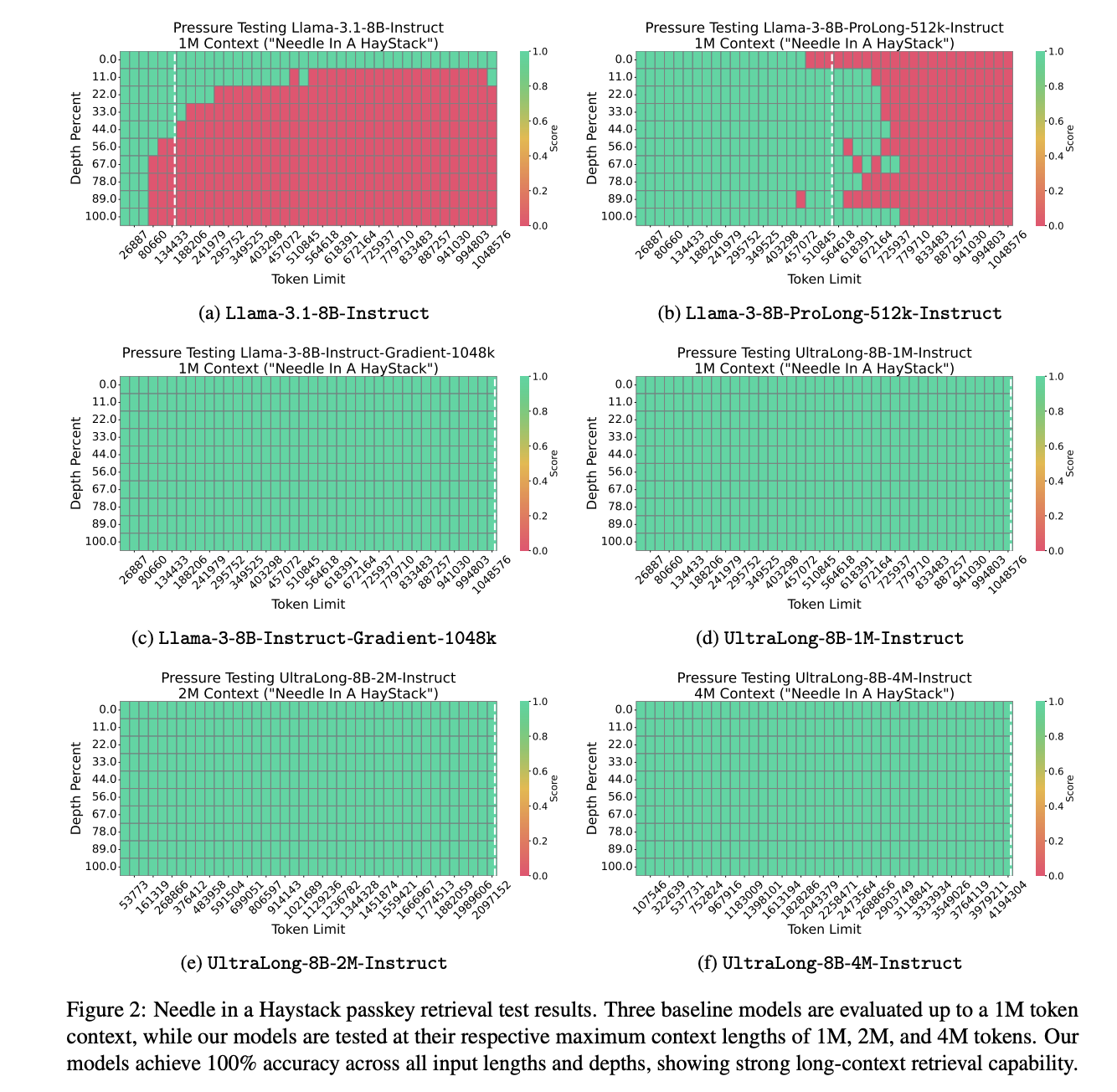 The proposed models show superior long-context retrieval capabilities in the Needle in a Haystack passkey retrieval test. Baseline models like Llama-3-8B-Instruct-Gradient-1048k pass the test, but Llama3.1-8B-Instruct and Llama-3-8B-ProLong-512k-Instruct show errors. In contrast, the UltraLong models achieve 100% accuracy across all input lengths and depths, showing strong retrieval capability. The UltraLong achieves the highest average scores on RULER for inputs up to 512K and 1M tokens, the highest F1 scores on LV-Eval within 128K and 256K token lengths, and the best performance on InfiniteBench. Moreover, the models maintain strong performance across general, math, and code domains with average scores of 62.47, 61.06, and 60.95, exceeding the base model& 61.45.