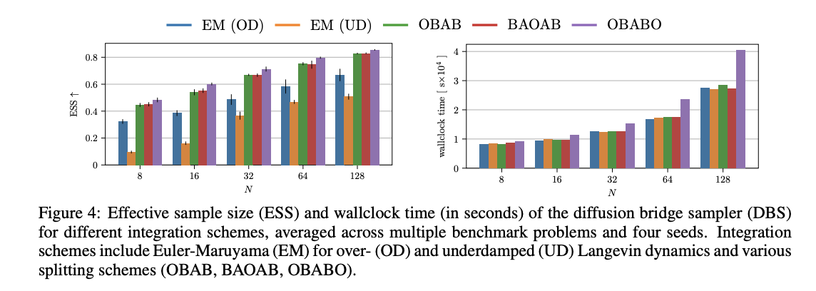 The results show that underdamped Langevin dynamics consistently outperform overdamped alternatives across real-world and synthetic benchmarks. The underdamped DBS surpasses competing methods even when using as few as 8 discretization steps. This efficiency translates to significant computational savings while maintaining superior sampling quality. Regarding numerical integration schemes, specialized integrators show marked improvements over classical Euler methods for underdamped dynamics. The OBAB and BAOAB schemes deliver substantial performance gains without extra computational overhead, while the OBABO scheme achieves the best overall results despite requiring double evaluation of control parameters per discretization step.