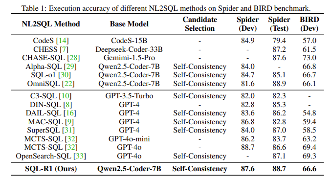 SQL-R1 achieved 88.7% accuracy on the Spider test set and 66.6% on the BIRD development set, using only a 7B base model (Qwen2.5-Coder-7B).