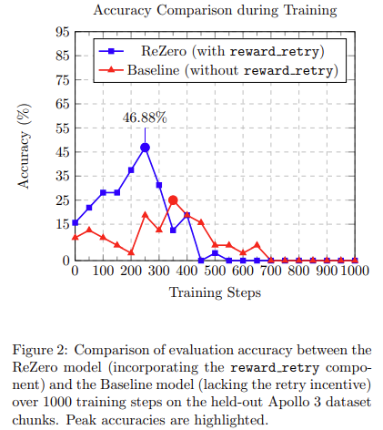 The research team implemented ReZero using the Llama3-23B-Instruct model and evaluated it on the Apollo 3 mission dataset. This dataset was split into 341 data chunks, with 32 reserved for testing. Training lasted approximately 1,000 steps (equivalent to three epochs) and was performed on a single NVIDIA H200 GPU. Two model configurations were compared: a baseline with three reward functions (correctness, format, em chunk) and ReZero, which included an additional reward for retrying. The performance gap between the two was substantial. ReZero achieved a peak accuracy of 46.88% at 250 training steps, whereas the baseline reached its peak at only 25.00% at 350 steps. Also, ReZero demonstrated faster learning in early training stages. However, both models experienced a sharp decline in performance afterward, reaching 0% accuracy by step 450 (ReZero) and step 700 (Baseline). This performance drop suggests potential overfitting or instability in extended RL runs, indicating the need for refined training schedules or improved reward balancing.