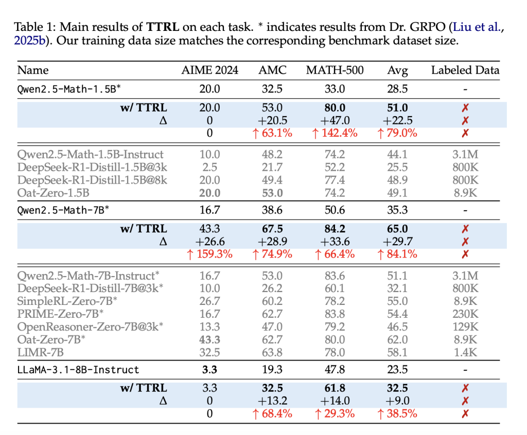 For Qwen2.5-Math-7B , performance on AIME 2024 increased from 16.7% to 43.3% (pass@1), an improvement of 159.3% without any labeled data.