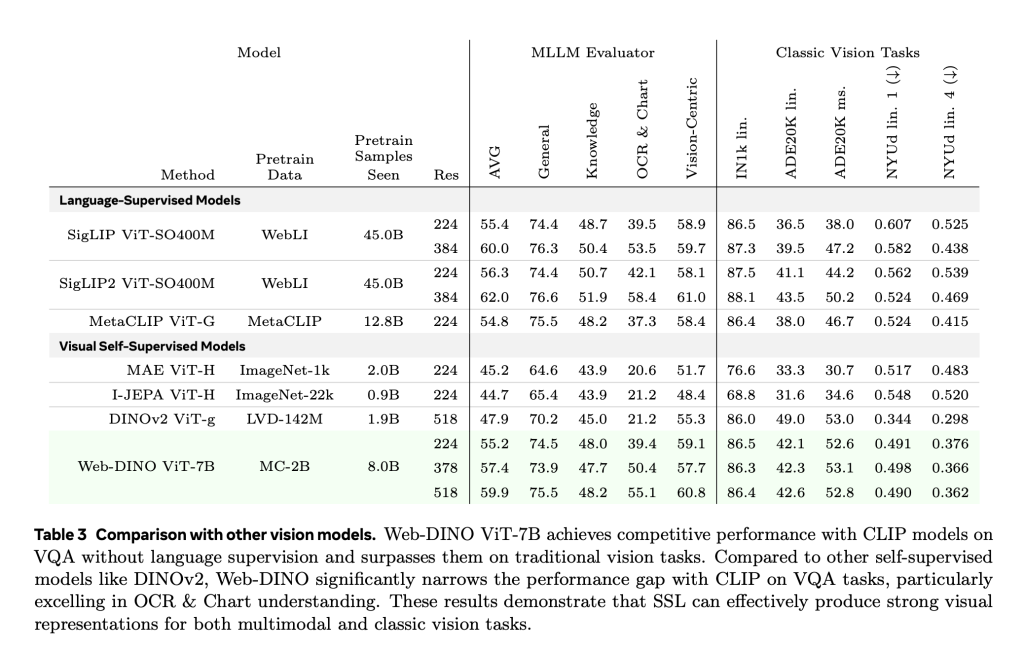 High-Resolution Training : WebSSL models fine-tuned at 518px resolution further close the performance gap with high-resolution models like SigLIP, particularly for document-heavy tasks.