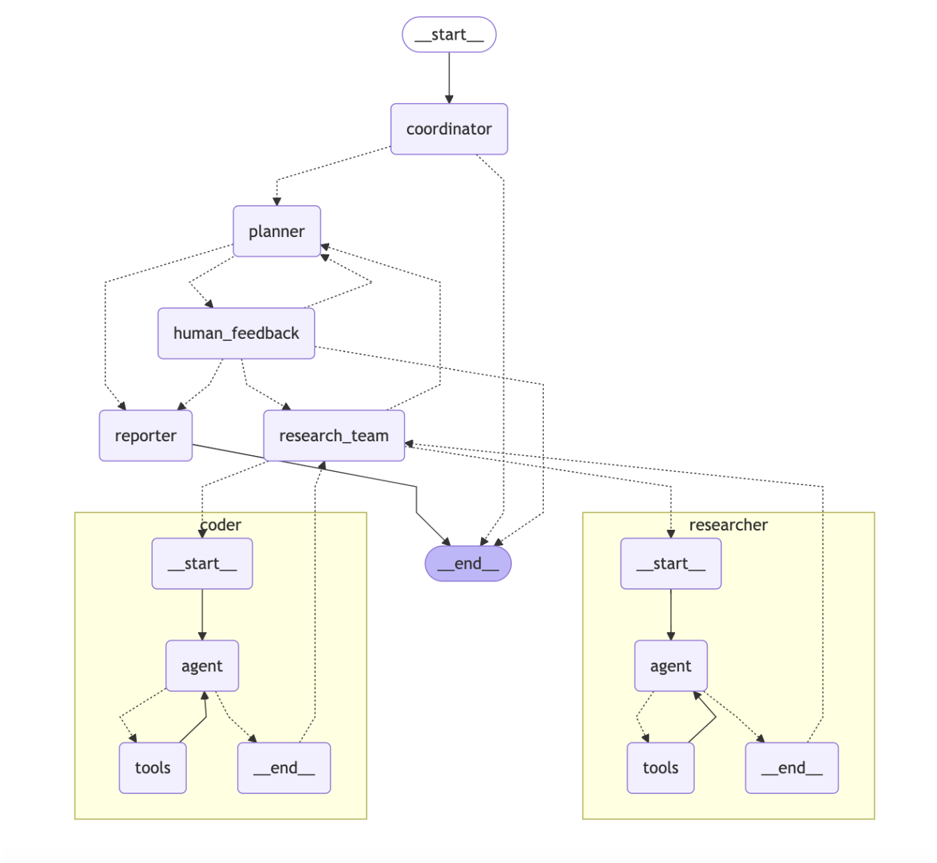 DeerFlow addresses this by adopting a multi-agent architecture, where each agent serves a specialized function such as task planning, knowledge retrieval, code execution, or report synthesis. These agents interact through a directed graph built using LangGraph, allowing for robust task orchestration and data flow control. The architecture is both hierarchical and asynchronous—capable of scaling complex workflows while remaining transparent and debuggable.