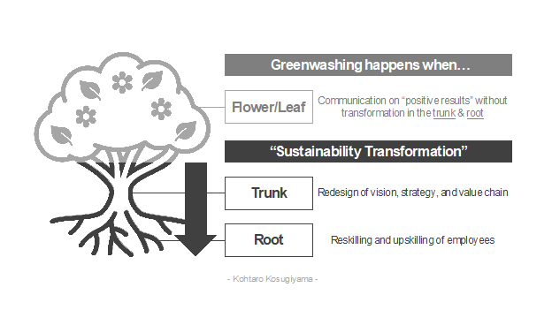 Imagine this as a company. The flowers/leaves are the business impact and result on the economy, society, and environment, the trunk the core activities such as management, strategy, and operations, and the roots are employee engagement. Most companies fall into the trap of capturing the close-up of flowers that bloomed beautifully without paying attention to the weak roots and the trunk. It takes time, but to avoid performative sustainability and achieve business authenticity, firms must transform core operation and empower their workers.